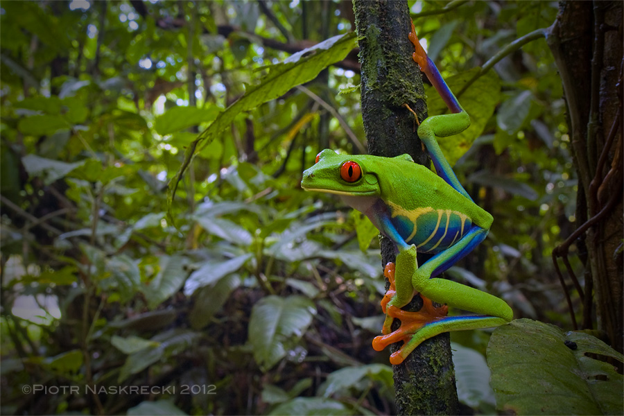 The difference in the effect of long versus short lenses can be seen in these two photos. The first one was taken with a 180mm lens (Sigma 180mm f/3.5 APO). This lens allowed me to get a very tight portrait of the iconic Red-eyed tree frog, while the background remains unobtrusively diffused. But this image lacks context, and it could have been taken in a studio (although it was taken in the Costa Rican rainforest.) For the second photo I used a very short lens (Nikkor 17-35mm f/2.8D IF-ED; technically not a macro lens, but one that focuses close enough to be used for small natural history subjects.) Here the background of the animal is prominently displayed, making for a much more interesting, engaging portrait. There is no doubt that this photo was taken in the animal’s natural habitat, and it conveys more information about the frog’s life.