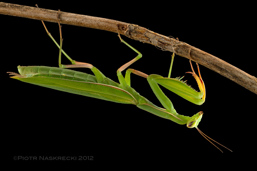 European preying mantis (Mantis religiosa) [Canon 7D, Canon 100mm macro, three speedlights Canon 580EX]I must admit that I have never liked photos taken at night that showed the subject, be it an insect or a person, against a pitch black background. If I am ever in a situation when a full-flash photo at night is the only option, I always try to put some light on the background by either framing the shot in such a way that something lighter is behind my subject (e.g., a large leaf behind an insect), or use an extra light, a second flash or a headlamp, to illuminate the background. I do not buy the argument that black background is the “natural” background for night organisms: there is nothing natural about an artificial, narrow beam of light illuminating a single subject; I cannot think of any animal, other than a person with a flashlight, who sees the world in this way. But there are situations where the black background can produce an esthetically pleasing, striking effect. Lightly colored or semi-translucent organisms look great against a black background, and black is also a good choice to show the highlighted outline of a creature.