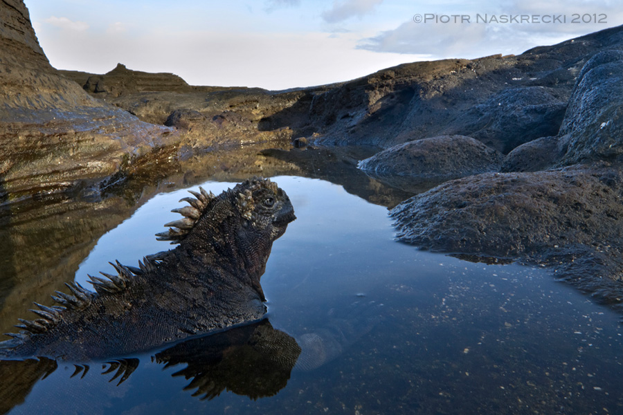 Marine iguana (A. cristatus mertensi) resting in a tidal pool on Santiago [Canon 7D, Canon 14mm]