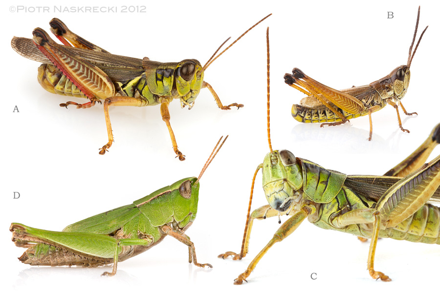 Browsers and grazers: A. Red-legged Grasshopper (Melanoplus femurrubrum); B. Marsh Meadow Grasshopper (Chorthippus curtipennis); C. Two-Striped Grasshopper (Melanoplus bivittatus); D. Short-winged Green Grasshopper (Dichromorpha viridis).
