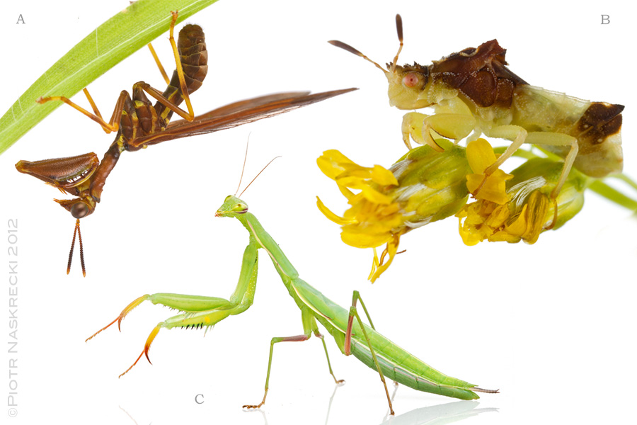 Sit-and-wait predators: A. Wasp mantidfly (Climaciella brunnea); B. Ambush bug (Phymata americana); C. European praying mantis (Manits religiosa).