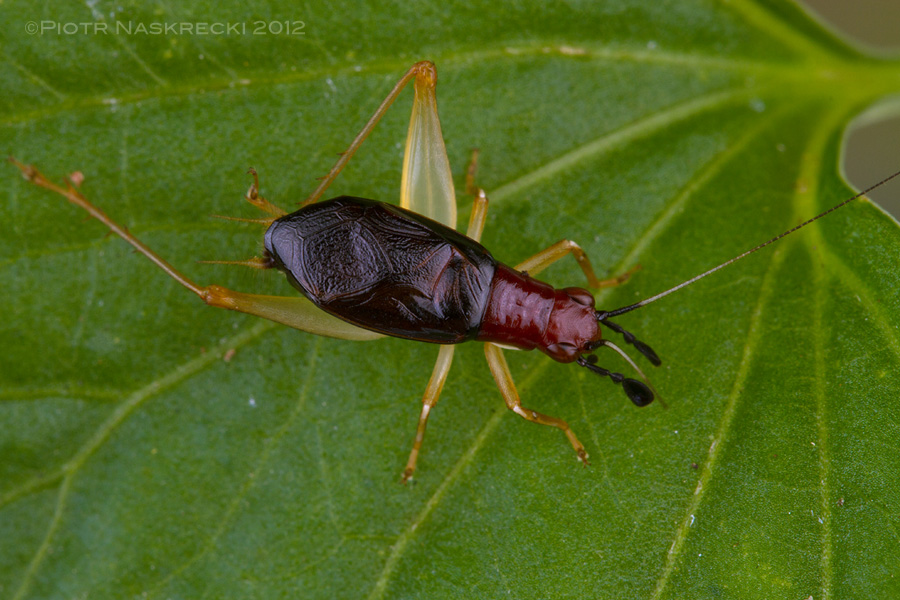 Exactly one month ago I saw my first Red-headed Bush Cricket, also known as the Handsome Trig. It was a tiny nymph, but it already carried its signature large mandibular palps, waving them like crazy. Yesterday, while in Estabrook Woods, MA, I heard a cricket call that I did not recognize. After my wife and I did  a bit of sleuthing in dense vegetation at the edge of a meadow, Kristin spotted the animal, and it was an adult male of the Handsome Trig. Its call is different from that of other small, diurnal crickets, which usually produced very even, continuous trills. In this species, however, individual pulses are in irregular groups, giving an impression that the cricket is stuttering a little.