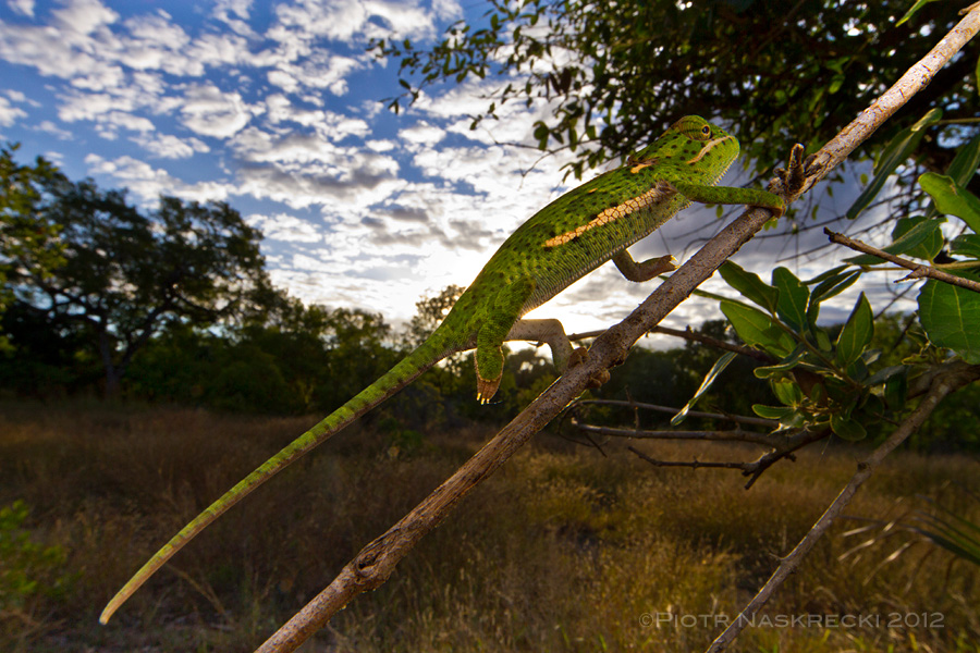 Flap-necked chameleon (Chamaeleo dilepis) from Mozambique; I framed the animal in such a way that its body blocked the sun, but I still needed to add some fill-in flash to counterbalance the brightness of the sky. [Canon 7D, Canon 14mm, Canon MT-24EX twin light]Exposing for shots against the sun is a little tricky. In my experience it is easier to use fully manual exposure controls, rather than using the camera’s automatic settings, such as the Aperture Priority. The easiest way to do it is to measure the exposure time by pointing the lens at a point close to the edge of the sun, but not the sun directly. Take a photo and see how the sun is exposed: its center should appear slightly overexposed, but its edges should not. Once you have found the correct exposure settings for the sun, add the counterbalancing light. Again, I would suggest using a flash in the manual mode, and adjust its power incrementally until you find the right intensity. It goes without saying that it is much easier to fine tune the exposure settings for subjects that are not particularly agile. Thus, I would suggest to practice the exposure adjustments on inanimate objects, such as branches or flowers, before you attempt to photograph a running beetle against the sun.