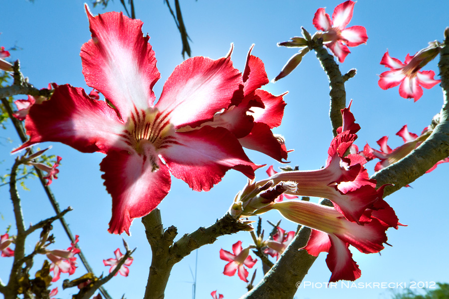 The flowers of the Impala lily (Adenium multiflorum) shot against the sun; here I did not need any fill-in light because the sunlight filtered through their corollas provided enough illumination. [Canon 7D, Canon 14mm]Nearly any lens can be used to shoot against the sun, but this approach works really well with wide angle lenses. This is because it is easier to fit both your main subject and a large portion of the sky into the frame, which in turn means that the sun itself does not dominate and overpower the scene. At the other end of the spectrum, really long macro lenses (150mm and more) can also be used, and their benefit is that the sun will appear larger in relation to your subject; they may, however, require a more powerful source of the fill-in light.