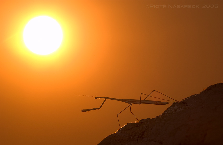 A grass mantis (Hoplocorypha sp.) from Botswana against the setting sun. Here I used only a very weak “pop” of flash because I wanted the insect to appear almost as a silhouette. [Nikon D1x, Sigma 180mm, flash Nikon SB-28DX]