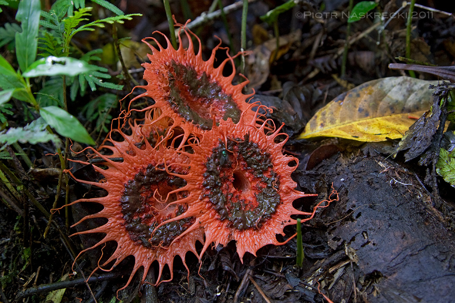 But tadpoles with terrestrial development were not the only animals that seemed out of place on the forest floor of New Guinea. High in the mountains of the Muller Range we found damselfly nymphs crawling on leaves of Pandanus trees, and below, in the leaf litter, pink amphipod crustaceans mingled with ants and beetles. I also saw in those forests land crabs, flatworms, and sea anemones. Well, the last ones turned out to be strange mushrooms of the genus Aseroë, but for a second I almost believed in the existence of terrestrial sea anemones – if they were to live on land, rainforests of New Guinea would probably come closest to their underwater habitat.