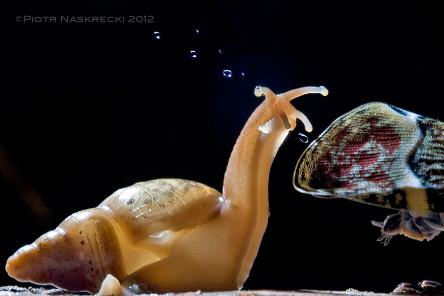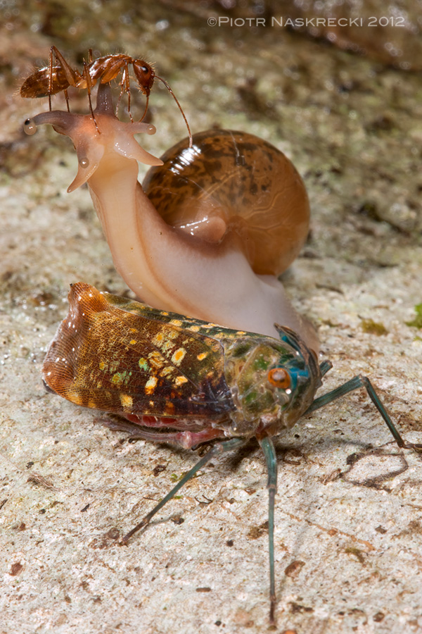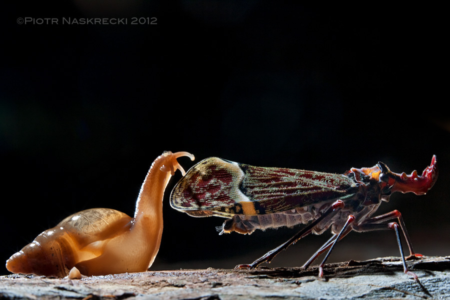Snail Euglandina aurantiaca tapping a lantern bug (Phrictus quinquepartitus) with its tentacles [Canon 1Ds MkII, Canon 100mm macro, 2 speedlights Canon 580EX]