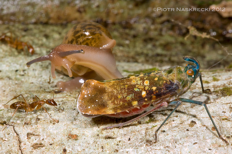 Lantern bug responds to tapping by sending a stream of honeydew droplets that accumulate on the snail’s foot [Canon 1Ds MkII, Canon 100mm macro, 2 speedlights Canon 580EX]