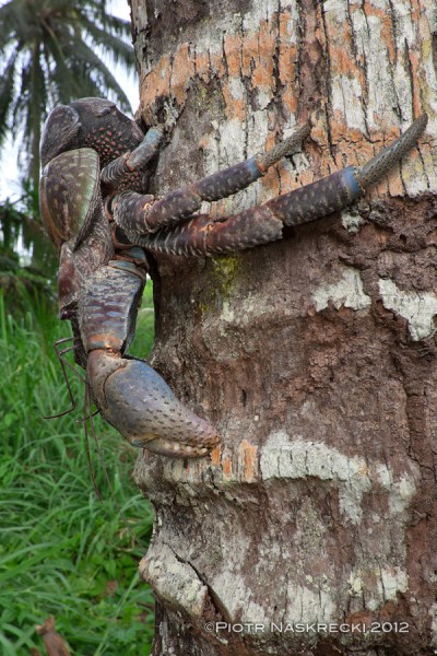 While I can honestly say that there is no animal that I find uninteresting, none is higher on my list of the most amazing animals than the coconut crab (albeit this top place in my ranking is shared by many.) The first thing that you will notice about this crustacean is of course its size – it is huge. In fact, with the maximum leg span of 1 m (~3 ft) and weight of 3 kg (6.6 lb), it is the largest invertebrate animal you will find on land. There exist larger marine crustaceans, and there are many much larger cephalopods, but on dry land the coconut crab is the undisputed champion. It is also incredibly long-lived, for a terrestrial invertebrate, reputedly capable of reaching the ripe age of 40 years.