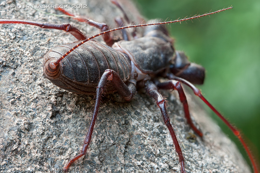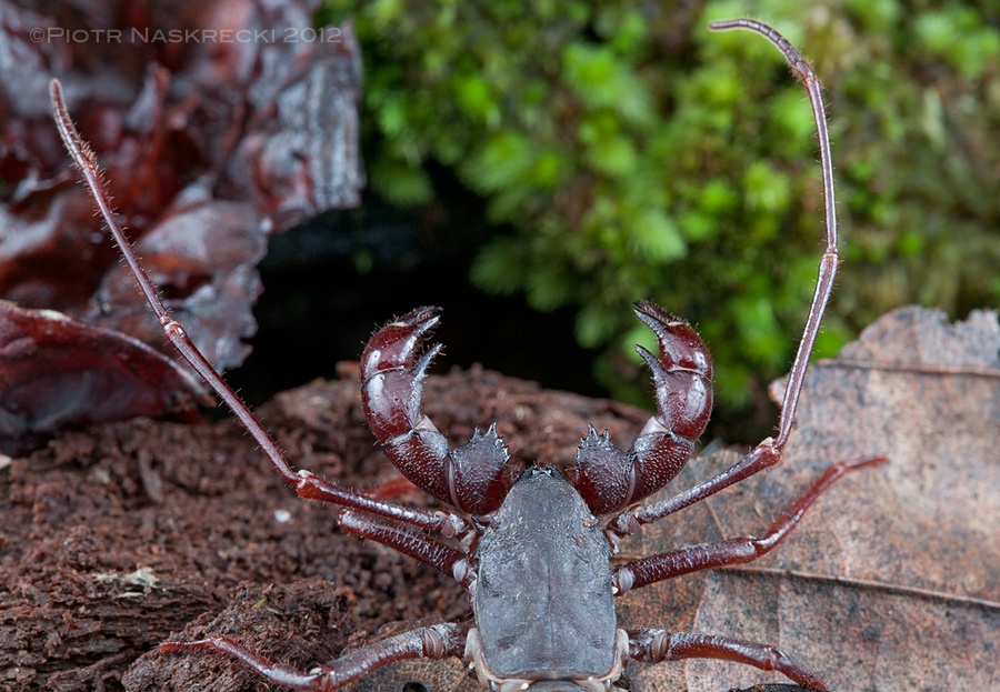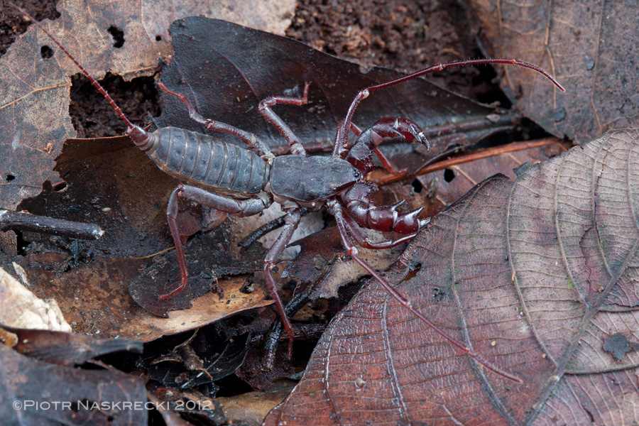 Vinegaroons use their first, long pair of legs as sensory organs to detect prey. The large “pincers” (pedipals) are mouthparts. (Thelyphonus sp., Cambodia)[Canon 1Ds MkII, Canon 100mm macro, 2 speedlights Canon 580EX]