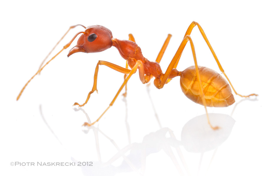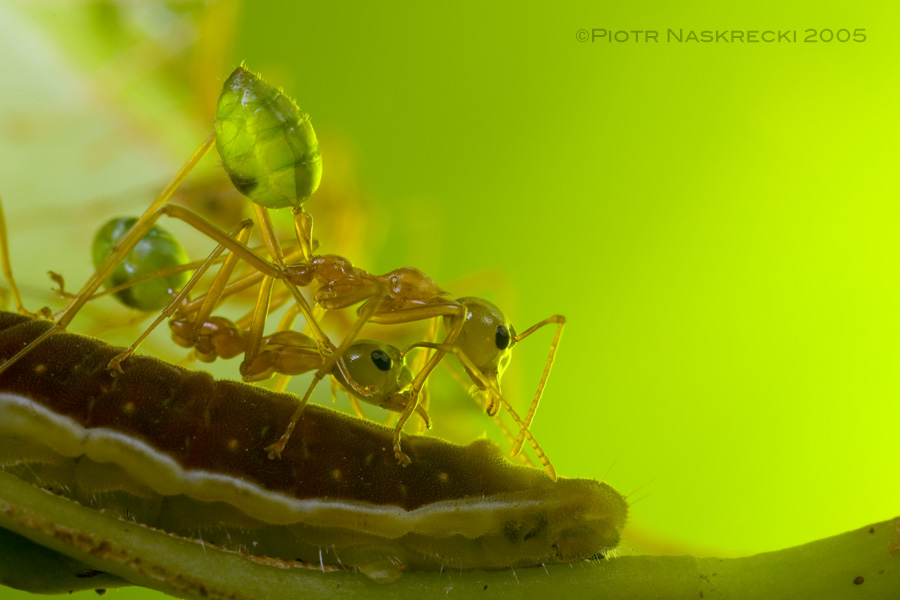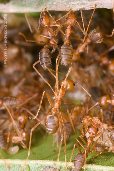 African weaver ant (O. longinoda) from Mozambique. [Canon 7D ,Canon MP-E 65mm, 3 speedlights 580EXII]Weaver ants are voracious hunters – I have seen them attacking grasshoppers, beetles, snails, even snakes, and they are not opposed to partaking of carrion. I have also felt them attacking me, and this is one of the reasons why these ants are not popular among gardeners in Australia – having them rain on you from a tree and spray formic acid on your skin is not one of the most pleasant experiences. But at the same time weaver ants can be quite beneficial. It has been shown that their presence increases fruit production of some plants, and reduces the amount of pesticides needed to control pests. Unfortunately, like most ants, they have a weakness for sugar, and will protect aphids and scale insects that cause damage to plants. In the end, their impact on agriculture is probably about neutral.