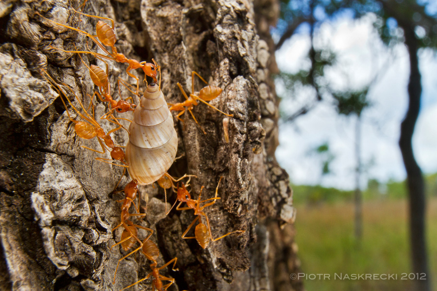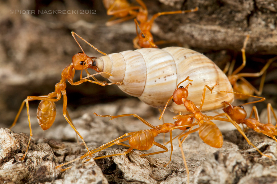 African weaver ants carrying a live snail to their nest (Mozambique). [Canon 7D, Canon 100mm, Canon MT-24EX twin light]