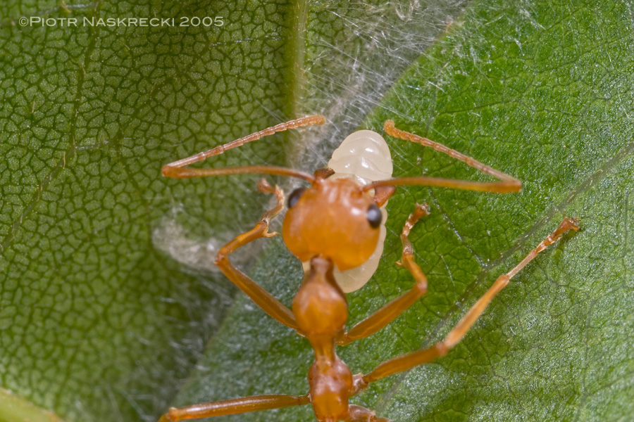 A worker of African weaver ant (O. longinoda) using a larva as a tube of glue to stitch together leaves (Guinea). [Canon 10D, Canon MP-E 65mm macro, Canon MT-24EX twin light]When we think of silk, the first thing that comes to mind is of course underwear. The second is silkworms, and the ancient Chinese who first employed these insects to produce sophisticated garments. But weaver ants can also produce silk, yet, rather than spinning protective cocoons like moths, they use it in a way that is remarkably similar to the way we use crazy glue.