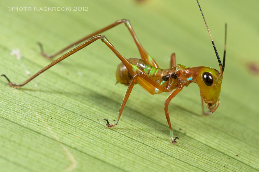 An ant-mimicking katydid Polichne sp. resembles a green weaver ant worker. [Canon 1D MkII, Canon MP-E 65mm macro, Canon MT-24EX twin light]Some insects take advantage of the aggressive nature of weaver ants and, by assuming a similar appearance and hanging around their nests, gain protection from predators who dare not to get close to the ants. Katydids of the Australian genus Polichneare some of them, and it is still unclear how they manage to convince the ants not to eat them (chemical mimicry is the most likely explanation.)