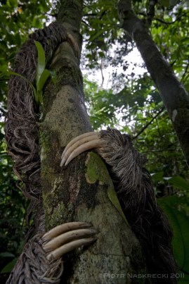 Sloths can achieve their large body size on nutritionally poor diet of leaves because they spend little energy on walking. [Canon 1D MKII, Canon 16-35mm, speedlight Canon 580EX]First, hanging from a branch, as opposed to standing on it, is much more efficient energetically. All you need is sharp claws to grasp the branch, and gravitation will make sure that these are firmly embedded in the bark, and no muscle power is required to keep the animal from falling. If you look at animals that spend their lives in this way – praying mantids, sloths, bats – you will notice that their leg muscles are severely reduced, and some can barely walk if forced to stand with the head pointing up. The energy that would otherwise go into legs can be diverted into other parts of the body: the powerful raptorial arms of the mantis or wings of the bat. (Sloths are a special case – the fact that they don’t need to walk allows them to grow really large, considering how nutritionally poor their food is. Any walking mammal their size would quickly starve if its diet were as meager as that of the sloth. )