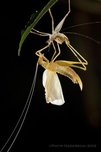Molting is the most dangerous time in the life of an insect. Using Earth’s gravitation to slip out of the old exoskeleton is the fastest and safest way to do it. (Katydid, Teleutias sp., from Suriname) [Canon 1Ds MkII, Canon 180mm macro, speedlight Canon 580EX]And finally, molting. A molt is a very special time in the life of an arthropod, a moment that we, mammals, cannot possibly identify with. It is a moment of ultimate weakness and vulnerability, and the faster you can go through it the better. So why don’t most insects use their legs to quickly crawl out of their old exoskeleton? The reason is that while the muscles of a molting insect or spider are fully functional, their points of attachment are not. Our muscles rest on the always rigid internal skeleton, and when we flex a muscle we don’t run the risk of bending a bone. But a molting insect does, because its exoskeleton, which contains points of attachment of all muscles, is at that point very soft. It can be easily distorted if any muscle is engaged while chitin, the polysaccharide that makes up the bulk of the skeleton, is still hardening. If an insect bends a leg during the molt, its exoskeleton may solidify in the bent position, making it unusable in the future. For this reason most terrestrial arthropods prefer to molt by slowly slipping out of their old, smaller exoskeleton, using the gravitational forces of Earth to their advantage.