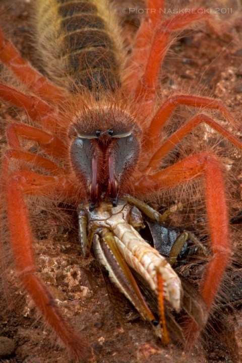 Solifugids (Solifugae) are the arachnid equivalent of a honey badger, the tireless, famously cantankerous African mammal. Like the badger, they are lonesome, opportunistic predators, constantly on the run, looking for something, anything, to sink their jaws in. They are big and they are fast. Really, really fast. Most are nocturnal and hate being exposed to the light (hence their name, Solifugae, Latin for “fleeing from the sun”.) But some are active in the middle of the day, although still preferring to stay in the shade as much as possible. This, of course, sometimes leads to comical misunderstandings – when you see a giant, hairy arachnid chasing you in the desert (and I can attest to the fact that it does happen!), be assured that it is after your shadow, not you per se. Just let it curl up against your leg, and all will be fine.