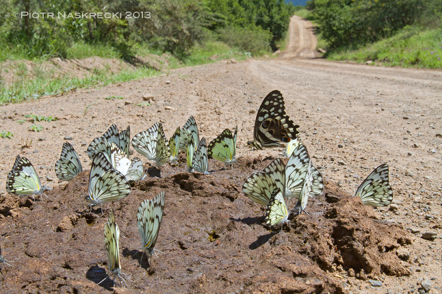 In Eastern Cape of South Africa, a beautiful flock of butterflies is puddling on the side of a road. [Canon 7D, Canon 16-35mm]The weather has become so unpleasantly cold that I try not to open my eyes while walking outside, out of fear that my eyeballs will freeze. (I was told that this would happen by my teacher in preschool; she also told me that eating candies makes worms lay eggs in my teeth, and that if I eat pears before swimming then I will drown. Why pears and not, let’s say, gooseberries, I have no idea, and I won’t even mention what she said would happen if I ran with scissors.) Anywho, the lifeless season outside the window makes me seek solace in memories of warmer places, luxuriantly abundant with life, and few phenomena better convey the feeling of life’s unbound exuberance than swarms of tropical butterflies.