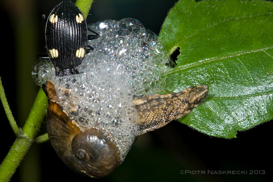 A ground beetle (Carabidae: Antiinae) attacking a land snail in Atewa, Ghana [Canon 1DMkII, Canon 100mm macro, Canon MT 24EX twin light]I had always been under the impression that snails defended themselves mostly with their calciferous shells, and that otherwise they were pretty vulnerable creatures. That changed when I ran across an interesting encounter between a pulmonate snail and a predatory ground beetle (Carabidae: Anthiinae) in the rainforest of Atewa plateau in southeastern Ghana. I did not see the very beginning of the encounter, but I imagine that the beetle attacked the snail, naively expecting no resistance other than a feeble attempt by the snail to pull itself into the shell. But he was in for a nasty surprise. For the next 10 minutes the snail systematically engulfed the beetle in a copious amount of foamy mucus that effectively prevented the beetle from getting anywhere near the vital organs of the snail. In the end the snail simply slipped down the branch in a protective cocoon of foamy mucus, while the unfortunate beetle was barely able to walk away, frantically trying to clean the mucus off its head.