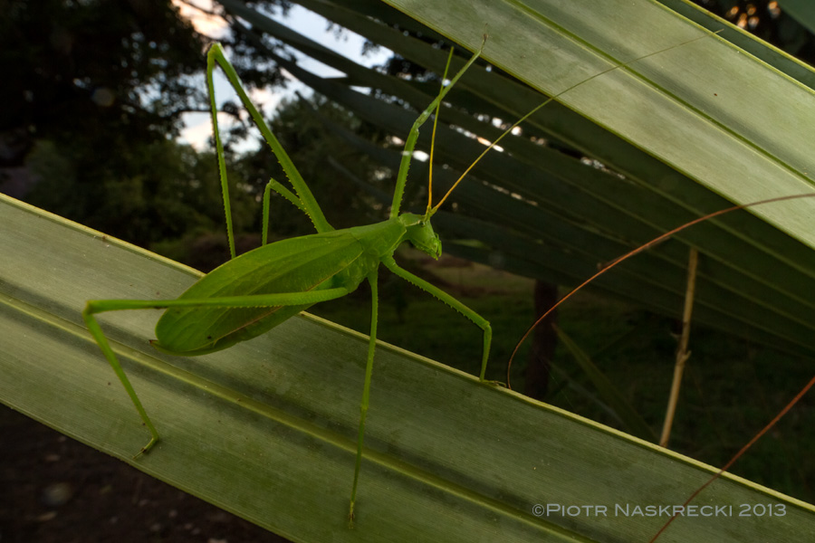 One of the first katydids I spotted was a female of Horatosphaga serrifera, an elusive species, known only from a small handful of specimens. This group of katydids is highly sexually dimorphic and males look nothing like this chunky, flightless female. [Canon 14mm, Canon MT 24EX twin light]
