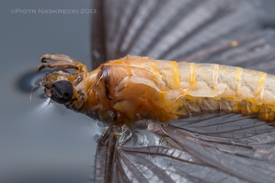 Once an adult male burrowing mayfly lands on the the surface of the water it dies within a few minutes. (The angel-like halo around this insect's head is a reflection of my flash, which normally I would not tolerate, but in this case it seems appropriate.)