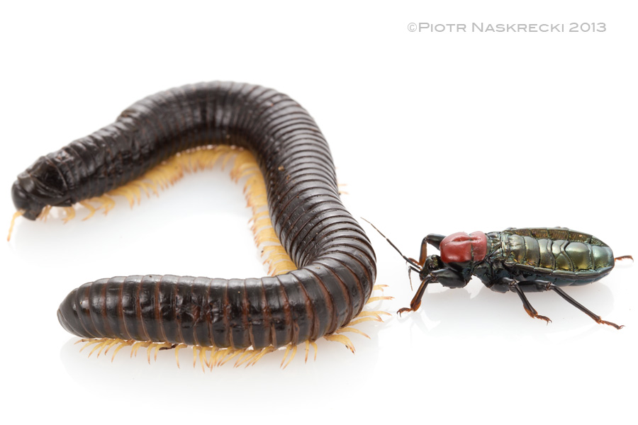 I placed the two animals on the white stage of my field photo studio and waited. After a few minutes the assassin bug noticed the millipede and started to approach it stealthily. With imperceptibly slow steps it climbed the millipede’s body and positioned itself almost upside down, with the head and rostrum facing the ventral side between the millipede’s legs. It was clearly aiming for the softest part of the body. And then, with an amazing speed, it pierced the millipede with its stiletto-like rostrum. The millipede’s reaction was dramatic – its body twisted and uncoiled like a spring, nearly sending it up into the air. After a few seconds the body relaxed, and yellow, acrid droplets started oozing from between its plates. This was the moment when the assassin bug decided to walk away.
