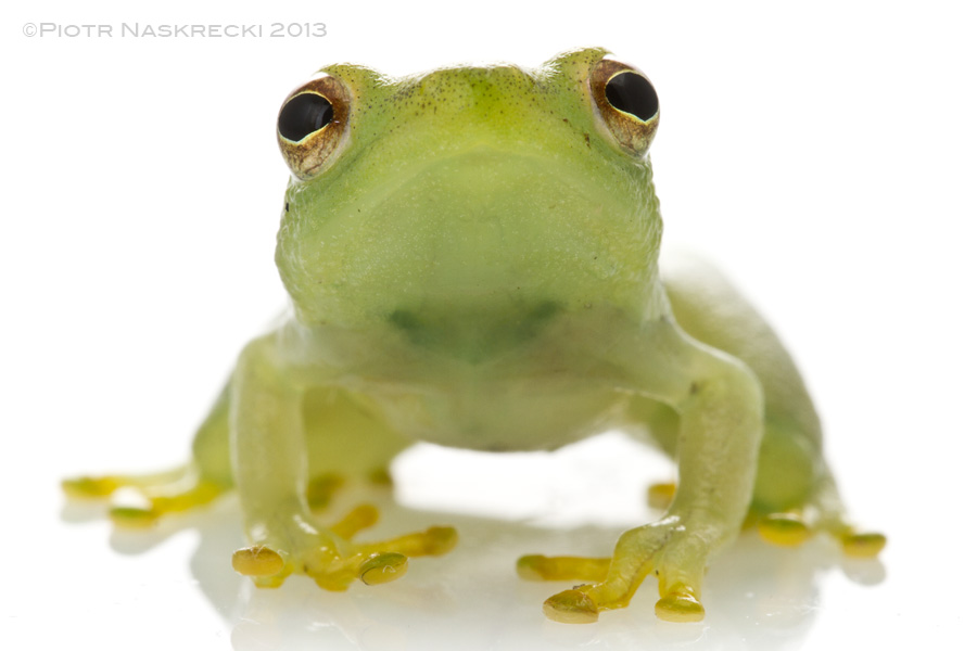 African reed frogs, like this Hyperolius cf. pusillus from Gorongosa National Park in Mozambique, have more typical eyes, positioned on the sides of the skull.