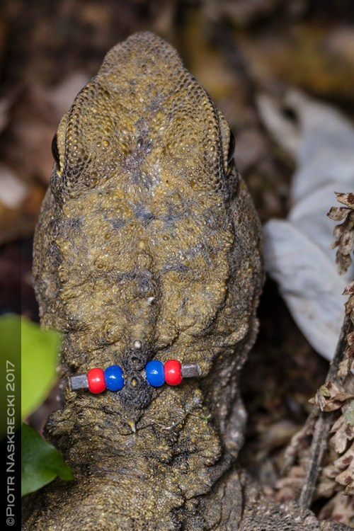 To help keep track of the movement of individual tuataras, each animal of the first batch of 70 released in Karori is marked with a unique combination of small color beads. Depending on the size of the animal, they may carry between 2 and 6 beads attached to their crest at the base of the head. Although the presence of beads somehow spoils the illusion of the animal being “wild,” a traditional alternative would have been to clip a toe or a combination of toes—a far more painful and risky procedure.