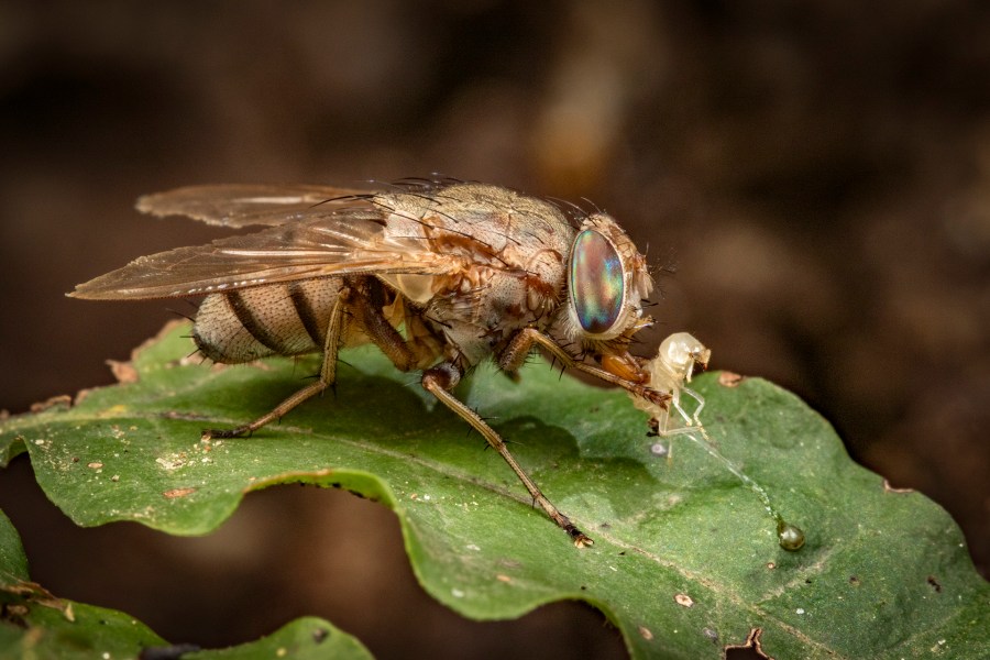 The development of Bengalia is nearly completely unknown. A larva of this fly (hatched from an egg laid under laboratory conditions) was described for the first time in 2016 and there is a single observation of a female lying eggs in the soil near an incipient colony of termites. Larvae of a closely related genus Verticia (Bengalinae) are parasitoids of termites, developing inside the head of termite soldiers, over time filling it completely, and eventually leaving the host by crawling through its neck, thorax, and abdomen, only to emerge at the posterior end (while the host is still alive). It is therefore quite likely that Bengalia larvae do something equally horrendous to termites. On a few occasions I found what looked like fly larvae in the termite colonies. I am now tempted to look for them again and attempt to rear them in hope of unraveling the mystery of Bengalia’s development. If I have any luck, you will be the first to know.✦