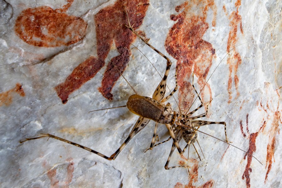 Crickets of the genus Phaeophilacris are large, spindly-legged creatures, found deep in the caves across Africa. In Mozambique, I often see them on the walls of caves occupied by large bat colonies, whose droppings and carcasses provide an ample and steady supply of food for the insects. Unlike other members of the large cricket family Phalangopside, Phaeophilacris have no hearing organs (tympanum) on their front tibia and the males lack stridulatory organs on their wings. This seems odd, since the darkness of the cave should make sound the ideal medium for communication and finding each other. But perhaps millions of years of coexistence with bats, animals known to target singing insects, exerted enough selective pressure to eliminate the risk of being overheard by the winged predators by removing the sound-producing organs and, consequently, the organs needed to hear it. But then, how do these mute and deaf animals manage to find mating partners in the complete darkness? And even if they find each other, what criteria do they use to decide who is and who isn’t a good one to entangle their genes with?