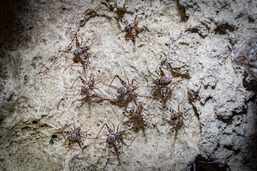 Phaeophilacris solved the first problem by overcoming the typically high levels of territoriality and aggression found in most crickets by becoming highly gregarious animals. Colonies of cave crickets often consist of dozens or hundreds of animals, squeezed together into crevices and holes in the walls of the cave. Even when out and about looking for food, their extremely long appendages covered with highly sensitive trichobothria (“hairs”) allow the crickets to be always in touch with other members of the group. In such tight settings, males can easily smell and detect females with their antennae as soon as the time for courtship comes.